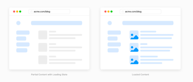 - 스트리밍: SSR로 렌더링을 하면 블로킹이 될 수 있음. 이를 개선하기 위해 스트리밍으로 페이지의 HTML을 작은 청크로 분할하고, 서버에서 클라이언트로 점진적으로 청크를 전송할 수 있음. 이를 통해 UI를 렌더링 하기 전에 모든 데이터를 기다릴 필요 없이 페이지의 일부를 더 빨리 표시할 수 있음